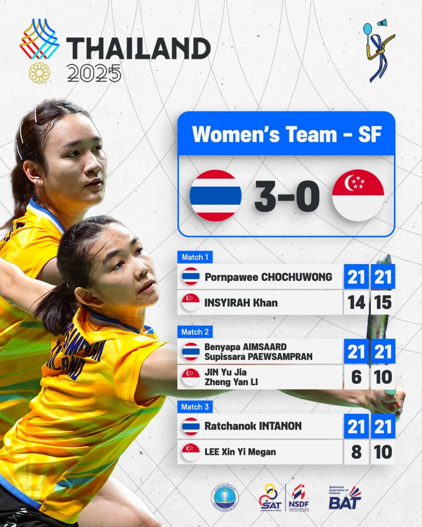 Ở trận bán kết 1, Thái Lan không mất quá nhiều thời gian để đánh bại Singapore trong bối cảnh tay vợt đơn nữ số 1 "Đảo quốc sư tử" - Yeo Jia Min không thi đấu với lí do được HLV Kim Ji-hyun đưa ra là "nghỉ ngơi để tạo điều kiện cho các tay vợt trẻ thi đấu".