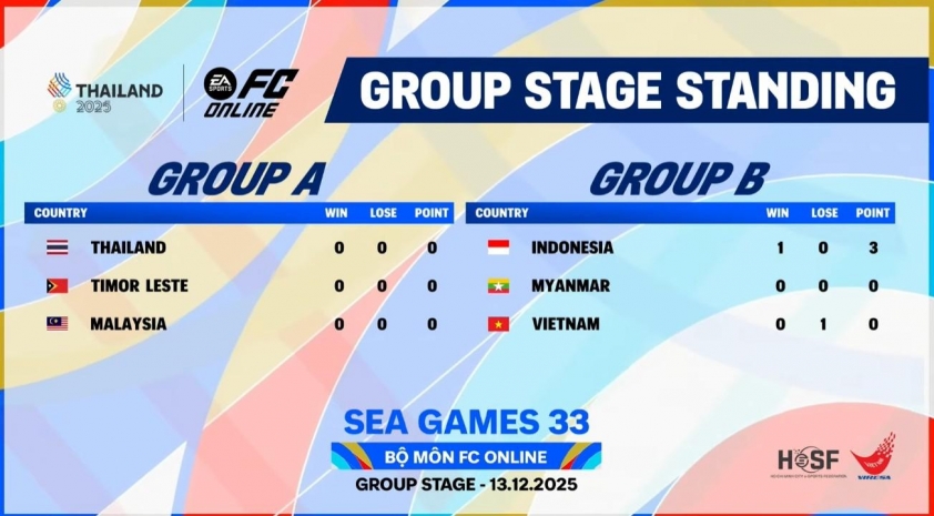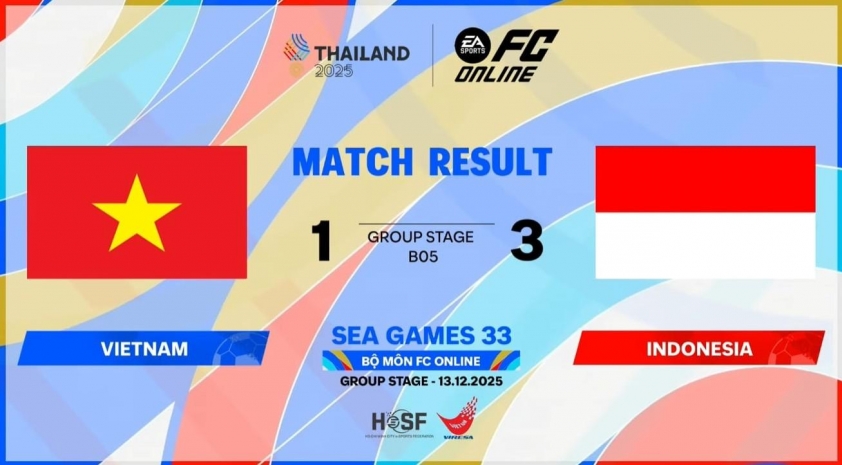 Đội tuyển FC Online Việt Nam đã không thể có khởi đầu như mong đợi tại SEA Games 33 – Thailand 2025, khi để thua Indonesia với tỷ số 1–3 trong trận đấu mở màn vòng bảng diễn ra ngày 13/12/2025.