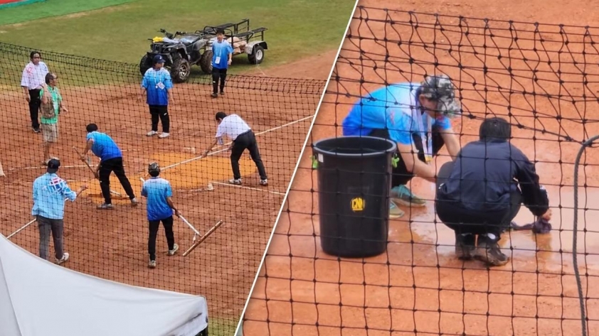 Hình ảnh sân bóng chày lầy lội, nhân viên phải dùng khăn lau nước trước trận Malaysia – Indonesia tại SEA Games 2025 khiến cộng đồng ASEAN “sốc” và chỉ trích công tác tổ chức của Thái Lan.