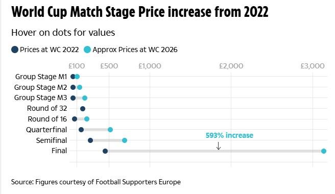 Chỉ riêng vòng bảng, người hâm mộ sẽ phải bỏ ra tới 436 bảng, cao gần gấp ba so với Qatar, nơi ba trận vòng bảng chỉ tiêu tốn khoảng 154 bảng. Vòng 32 đội (lần đầu tiên xuất hiện trong lịch sử World Cup) cũng được dự báo có mức giá 175,1 bảng. Càng vào sâu, chi phí càng tăng chóng mặt: 219,8 bảng cho vòng 16 đội, 506,7 bảng cho tứ kết và 685,6 bảng cho bán kết. Tất cả đều cao hơn rất nhiều so với mức giá ở Qatar cách đây bốn năm.
