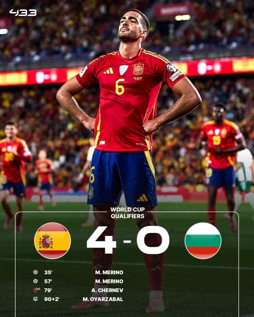 Rạng sáng 15/10 (giờ Việt Nam), Tây Ban Nha có cuộc tiếp đón Bulgaria trên sân nhà, trong khuôn khổ lượt trận thứ 4 vòng loại World Cup 2026 khu vực châu Âu. Dưới sự cổ vũ của đông đảo khán giả, thầy trò HLV Luis de la Fuente đã trình diễn một lối chơi tấn công rực lửa và giành chiến thắng thuyết phục 4-0.