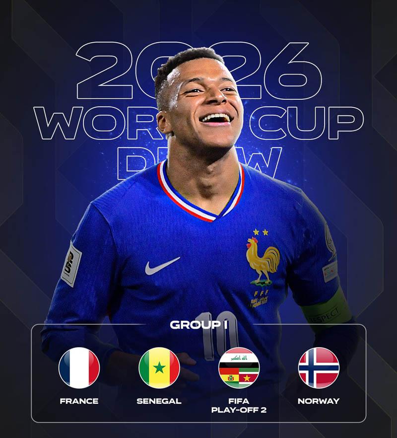 Tại Trung tâm Biểu diễn Nghệ thuật John F. Kennedy (Washington D.C., Hoa Kỳ) vừa qua, đội tuyển Pháp biết được 2/3 đối thủ trong khuôn khổ vòng bảng World Cup 2026. Cụ thể, đoàn quân của HLV Didier Deschamps sẽ đối đầu với Senegal và Na Uy tại bảng I vào mùa hè tới tại Mỹ. Tuy nhiên, đối thủ cuối cùng Les Bleus sẽ gặp là ai vẫn còn phải chờ đợi kết quả từ các trận play-off của nhánh liên lục địa với những cái tên tiềm năng như Bolivia, Suriname hoặc Iraq.