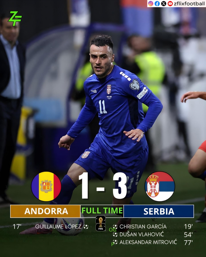 Một pha bóng gây kinh ngạc từ giữa sân khiến Serbia phải chịu bàn thua trước Andorra ngay những phút đầu trận vòng loại World Cup 2026.