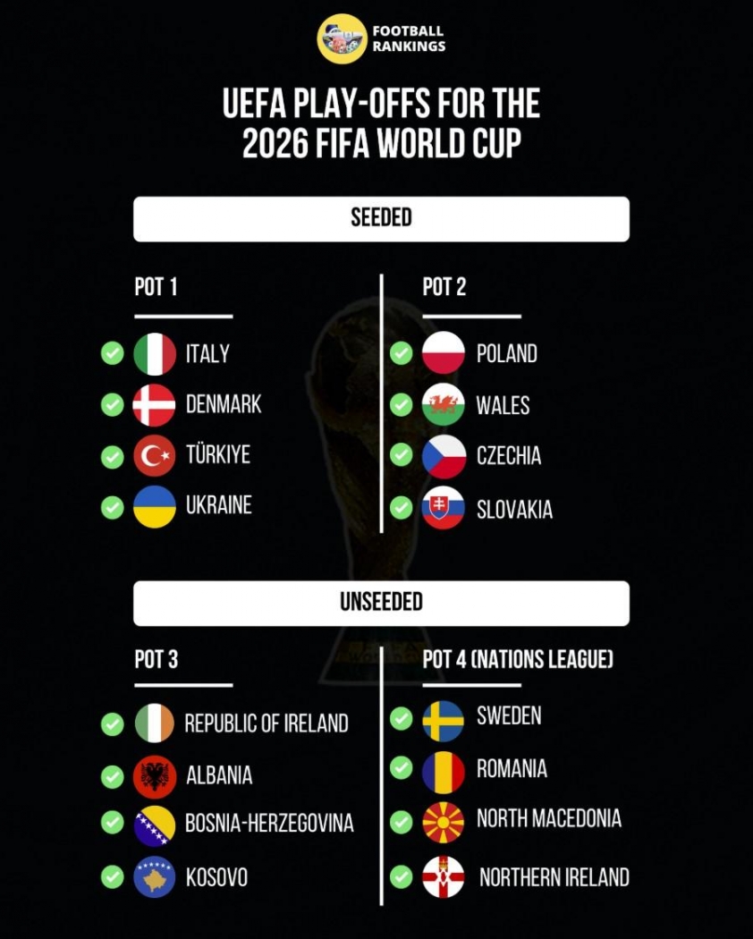 Tuy nhiên, Play-off năm nay trở nên cam go hơn khi nhiều đội bị mất trụ cột. Ireland sẽ không có Festy Ebosele và Liam Scales vì án treo giò. Đan Mạch chịu tổn thất lớn khi cả Rasmus Kristensen và Joachim Andersen đều không thể góp mặt trong trận bán kết. Ukraine mất hai cầu thủ quan trọng là Yukhym Konoplya và Ruslan Malinovskyi. Ba Lan vắng Nicola Zalewski, còn Bắc Macedonia mất Tihomir Kostadinov - những thiếu vắng có thể ảnh hưởng trực tiếp đến cơ hội đi tiếp.