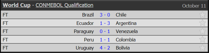 Đã xác định xong 4 vé dự World Cup 2018 khu vực Nam Mỹ là Brazil, Uruguay, Argentina, Colombia. Peru đá tranh vé vớt.