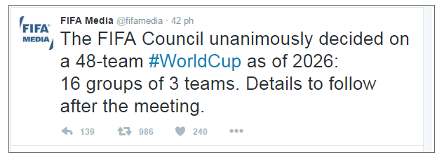 Trên trang Twitter chính thức của LĐBĐ thế giới, cơ quan này đã xác nhận: “Hội đồng FIFA đã đạt được sự nhất trí về quyết định mở rộng World Cup bắt đầu từ năm 2026. 48 đội tuyển sẽ được chia thành 16 bảng đấu với 3 đội mỗi bảng. Thông tin chi tiết sẽ được công bố sau buổi họp”.